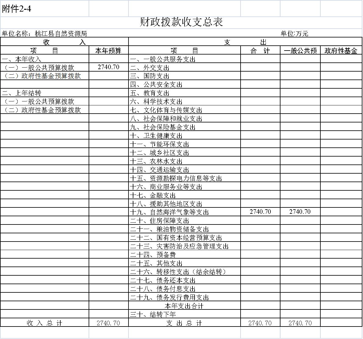 2020年一般公共预算拨款支出预算2740.7万元,其中自然资源海洋气象等支出2740.7万元,占100%;