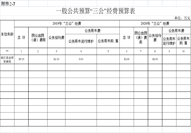 2020年本部门机关本级及乡镇国土资源所、下属14个二级机构“三公”经费预算为82万元,其中:因公出国(境)费0万元,公务用车购置费0万元,公务用车运行维护费0万元,公务接待费82万元。2020年“三公”经费预算较2019年减少3.13万元,下降3.68%,主要是公车改革取消了公务用车。