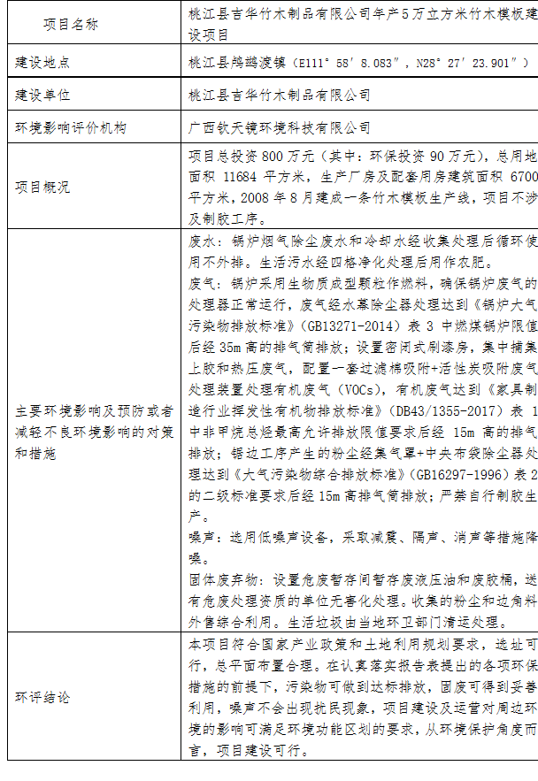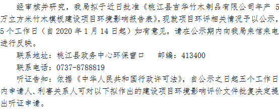 益阳市生态环境局桃江分局拟对桃江县吉华竹木制品有限公司年产5万立方米竹木模板建设项目环评作出审批的公示