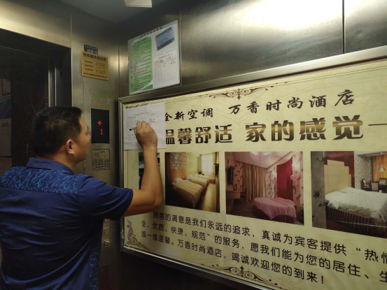从7月3日至7月8日,该局工作人员通过现场查看、翻阅资料、面对面交流等形式对桃江县中海城大酒店、桃江县大汉酒店、桃江县锦龙大酒店等13家考生住宿点的电梯安全运行状况进行了检查,重点检查了设备是否在检验有效期,是否有维保记录,安全注意事项和警示标志是否张贴,应急救援电话、报警装置是否有效等项目,同时在电梯醒目位置张贴《桃江县市监局高考期间特种设备巡查表》13份,对存在安全隐患的3家酒店进行了立即整改。