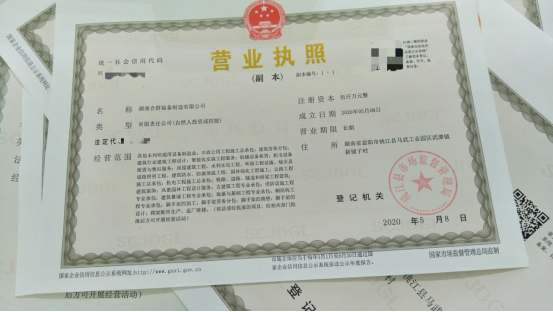 “这是贵公司营业执照,祝您的项目一切顺利!”5月8日下午,武潭市监所工作人员将办好的营业执照送至湖南合群装备制造有限公司负责人手中。