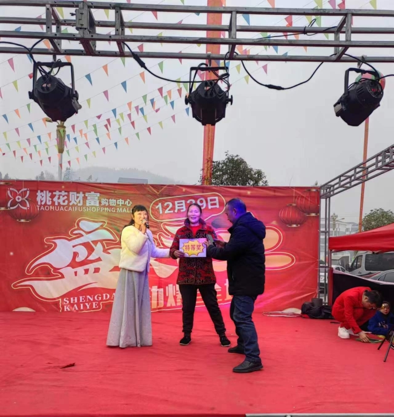 “哇!特等奖!恭喜这位大妈喜提电动车一辆……”这是武潭镇桃花财富购物中心开业现场消费群众抽中大奖的场景。