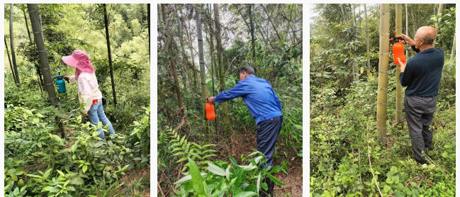 竹林中,在技术人员的指导下,镇村干部与群众志愿者们有的负责用钻孔机在竹子上打孔,有的负责注射药剂,有的负责喷药,大家分工有序,配合默契,现场一片忙碌景象。据武潭镇林长办相关负责人介绍,4月底~5月中下旬正是处于跳蝻出土期,目前最有效的方法是竹腔注射,防治有效期可达30~45天,辅以喷雾法灭杀已经密集出土的竹蝗,从而达到单位面积的病虫害不致扩散的目的。