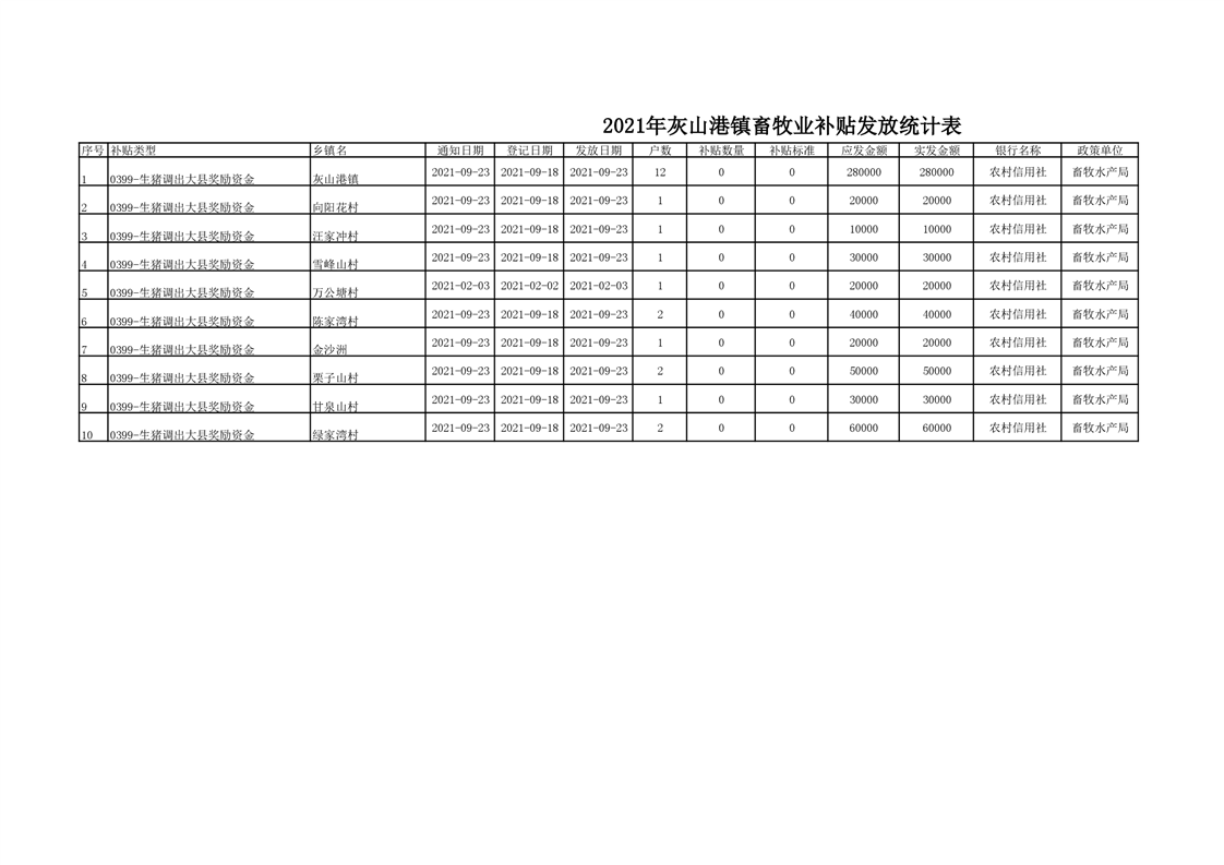 2021年灰山港镇畜牧业补贴发放统计表