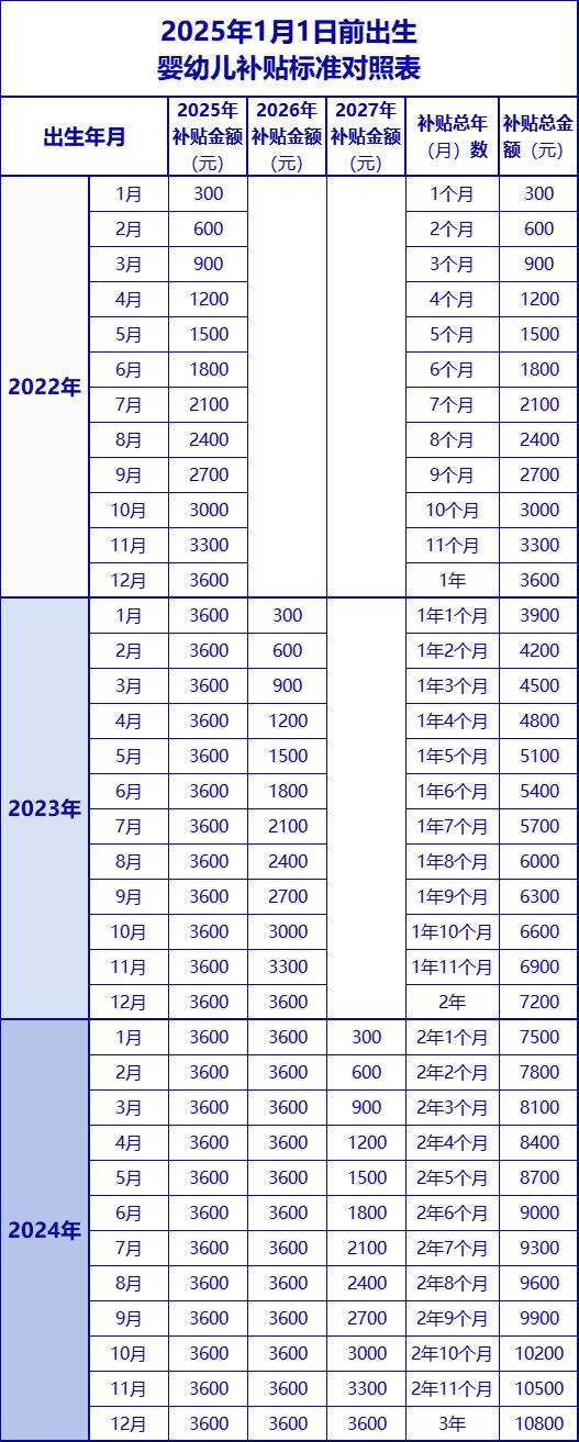 2025年1月1日及以后出生的婴幼儿,可连续3年领取育儿补贴,共计10800元。