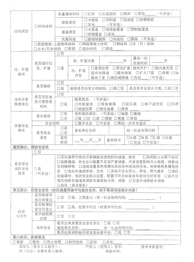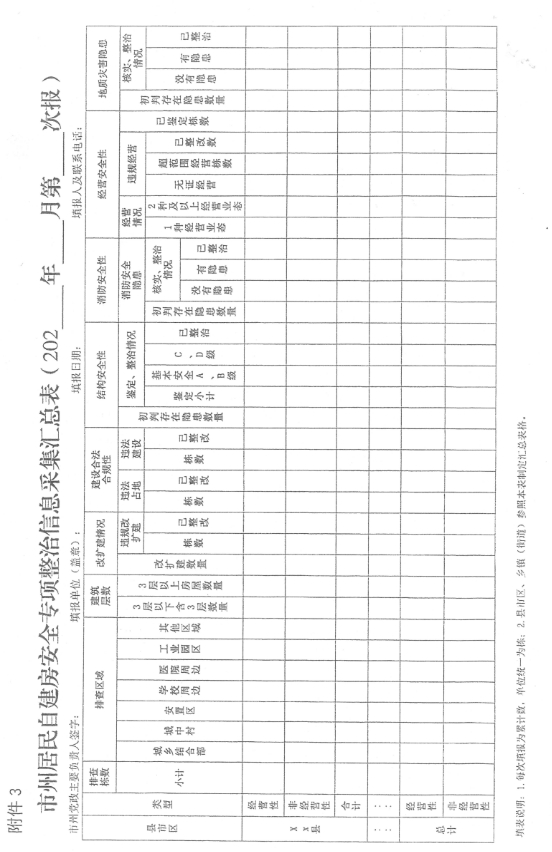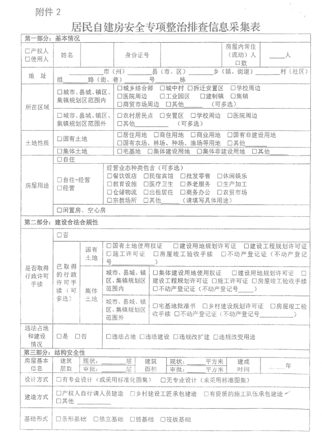 灰山港镇居民自建房安全专项整治工作及百日攻坚行动方案 为认真学习贯彻习近平总书记对长沙居民自建房倒塌事故的重要指示要求,贯彻落实李克强总理等党和国家领导同志的批示精神,深刻吸取教训,举一反三,切实保障人民群众生命财产安全和社会大局稳定,按照省、市、县各级党委政府部署,现制定本工作方案。 一、总体要求 认真贯彻落实习近平总书记关于安全生产的重要论述,牢固树立以人民为中心的发展思想,践行“生命至上、安全第一”的安全发展理念,强化红线意识和底线思维,落实属地责任,坚持远近结合、标本兼治,严控增量、消化存量,全面实施全省居民自建房安全专项整治工作,依法依规、科学精准、及时有效消除居民自建房安全隐患,坚决遏制重特大事故发生。 二、主要任务 (一)全面排查摸底 1. 排查范围和内容。本行政区域范围内城乡所有居民自建房,不漏一户、不错一栋,不留空白、不留死角。要全面摸清居民自建房基本情况,重点排查房屋安全“四性”,即:建设合法合规性(土地、规划、建设等),结构安全性(设计、施工、使用等),消防安全性(建筑材料、防火分隔、安全疏散、用火用电等),经营安全性(各类经营许可、场所安全要求等)。 2. 排查时限和要求。2022年6月30日前,完成经营性居民自建房排查工作。2022年8月31日前,完成非经营性居民自建房排查工作。落实产权人(使用人)自查、村(社区)普查、乡镇(街道)排查、县级复查的排查工作机制。 第一步:在自查中,产权人(使用人)应主动提供房屋使用、租赁经营及安全状况的真实信息,并配合填报人员及时准确填报信息。 第二步:在普查中,要做到产权人(使用人)、村(社区)人员、专业技术人员“三到位”,真实填报信息、核实信息、拍照并上报。 第三步:在排查中,乡镇应组织人员逐户排查,对重点地区排查做到不漏一户一栋。 第四步:在县级复查中,经营性居民自建房资料复查率应达到100%,现场入户抽查比例不低于经营性居民自建房总户数的30%、不低于非经营性居民自建房总户数的10%,在现场入户抽查中两项合格率低于95%的乡镇应重新普查。 第五步:迎接市级抽核。市将对我镇列入整治库的所有房屋全覆盖进行资料抽查,并将开展入户抽查;对未列入整治库的经营性居民自建房进行入户抽查,在入户抽查中两项合格率低于95℅的将要求重新复查。 第六步:迎接省级考评。省将对市州经营性居民自建房资料库进行抽查、现场核查,乡镇和相关县直部门要做好迎检工作。县住房和城乡建设局、县自然资源局、县市场监督管理局、县工改办等相关部门要按省要求,依托省房屋建筑和市政设施普查信息系统,建立居民自建房安全专项整治数据库、隐患库、整治库,实现与省工程建设项目审批系统、不动产登记系统、市场监管及消防验收和备案系统互通互查,强化动态管理,及时核准、补录和修正相关数据。 3. 排查评估和鉴定。产权人(使用人)主动提供房屋使用、租赁经营及安全状况的真实信息,属经营性居民自建房的必须提供房屋安全鉴定报告;本镇完成信息复核和安全隐患初步判定;县级委托房屋安全鉴定机构对初步判定存在安全隐患的房屋立即开展安全性评估或鉴定,特别对经营性居民自建房,要组织专业技术力量进行评估或鉴定,并将评估或鉴定结论作为开展整治的依据。坚持边排查、边鉴定、边整治,坚决做到“人不进危房、危房不进人”。经评估或鉴定房屋有重大安全隐患的,必须依法立即停用,并做好相应的安全防范防护措施。 (二)彻底整治隐患 1. 建立整治台账。本镇应根据鉴定情况,建立整治台账,实行销号管理,完成一户、销号一户。 2. 分批分类整治。全镇居民自建房安全整治工作,按照“一户一策、一栋一策,先急后缓、先大后小”原则开展。①2022年5月20日至8月31日实施百日攻坚行动(具体方案见附件1),完成城乡结合部、城中村、安置区、学校和医院周边、工业园区等重点区域,人员密集、涉及公共安全的经营性居民自建房,特别是三层以上、涉及 10人以上出租经营、违规改建扩建(含私自加装电梯)的经营性居民自建房安全整治工作;②2022年12月31日前,完成其他经营性居民自建房安全整治工作;③2023年6月底前,完成非经营性居民自建房安全整治工作。 对居民自建房凡属于以下四类情形的,依法采取“改、停、封、拆”措施予以分类处置:①对手续不齐全且属于违法建设的“必改”,限期整改到位后才能投入使用;②对不符合经营性安全要求的“必停”,在完善相关经营许可并取得房屋安全鉴定合格证明后才能投入经营;③对合法合规但有重大安全隐患可能威胁公共安全的“必封”,在安全隐患彻底消除且取得房屋安全鉴定合格证明后才能投入使用;④对有重大安全隐患且属于违法建设的“必拆”。 (三)强化安全管理 1. 严格控制增量风险。新建居民自建房必须严格依法依规办理规划、用地、建设等相关手续,其中三层以上(含三层)建筑面积300平方米以上、投资30万元以上的居民自建房以及安置区内房屋要纳入基本建设程序管理。 2. 加强日常巡查和投诉举报。落实属地责任,充分发挥综合执法、社区、物业、村支“两委”作用,健全房屋安全管理员和网格化动态管理制度,建立房屋安全巡查和问题发现机制。对举报存在安全隐患居民自建房的社会公众,当地政府给予