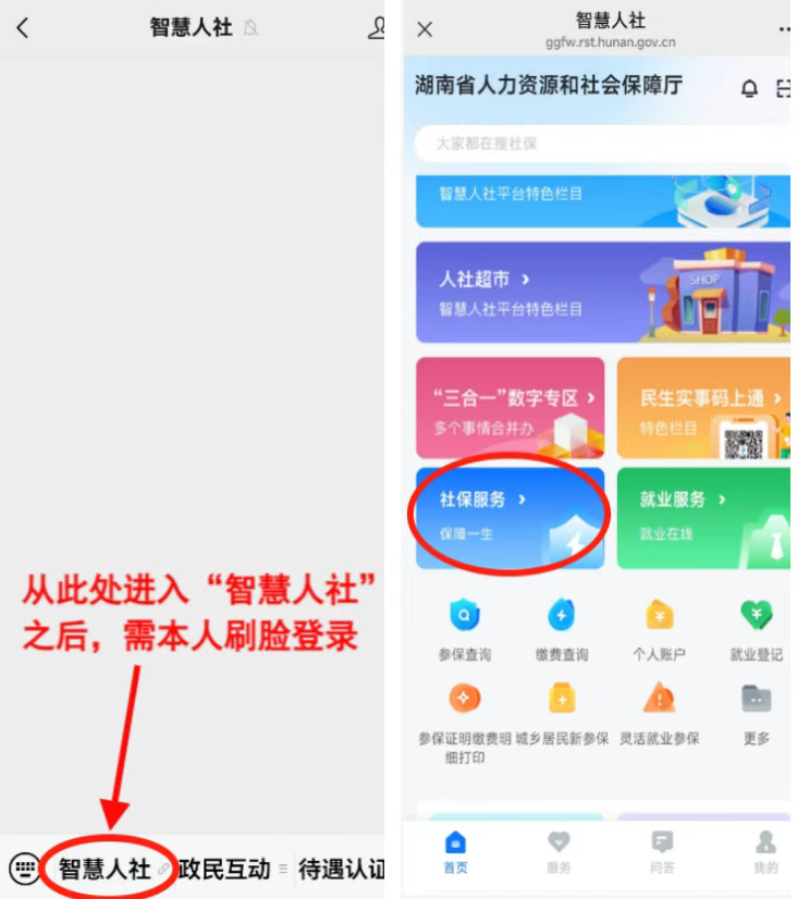 为方便参保群众补缴城乡居民养老保险保费,进一步畅通保费补缴渠道,避免参保群众人社、税务部门“两头跑”,推动待遇水平提高,近日,省人社厅在“智慧人社”上线了2019年度以前的城乡居保保费补缴(含提档补缴)功能。群众可通过“智慧人社”申请补缴保费功能操作,完成后即可通过“湘税社保”APP进行缴费,实现“零跑腿、掌上办”。 调档补缴申请流程 1扫码并关注“智慧人社”微信公众号,点击智慧人社专区,进入首页,在页面下方点击“社保服务”专区;