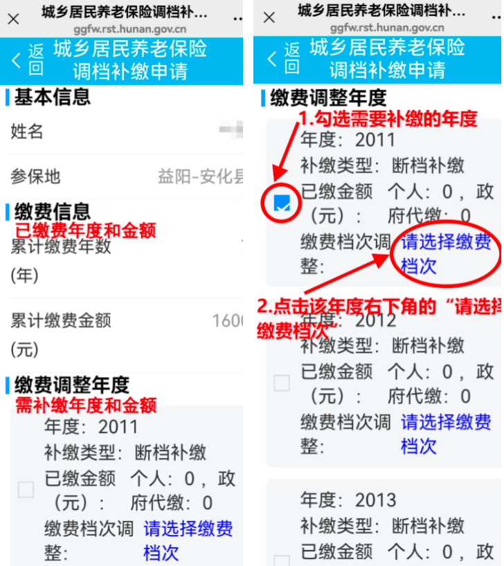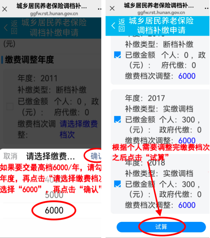 3勾选需要补缴的年度(如2011年),点击“请选择缴费档次”,点击页面下方“试算”;