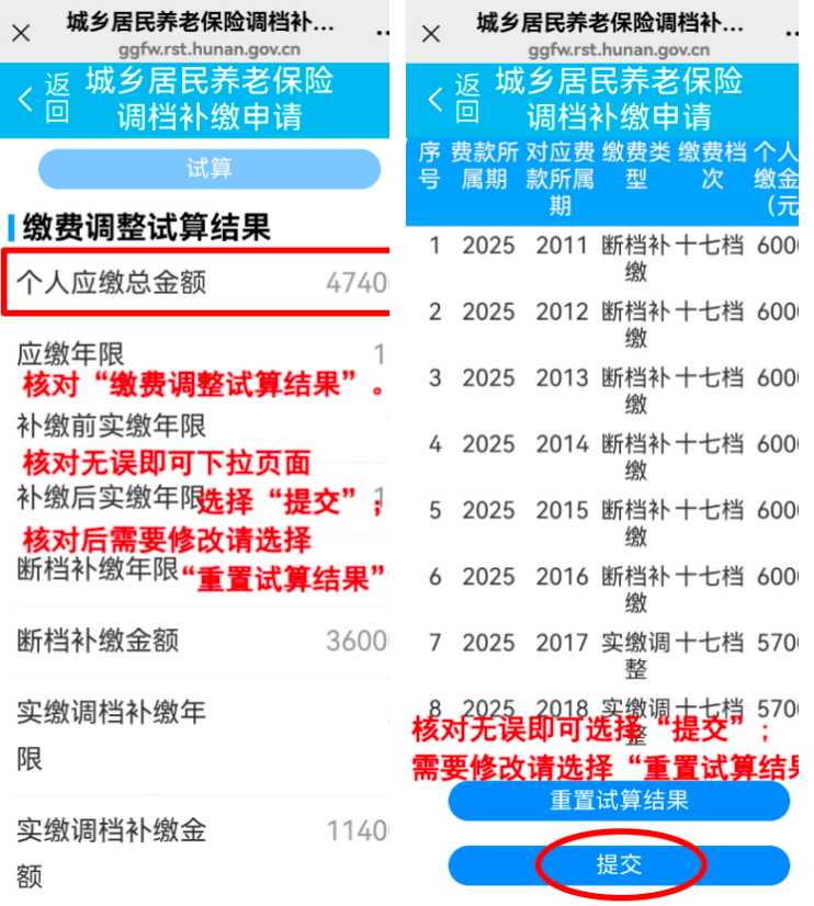 4查看试算结果,核对后需要修改的点击“重置试算结果”;核对无误的,点击“提交”、确认;