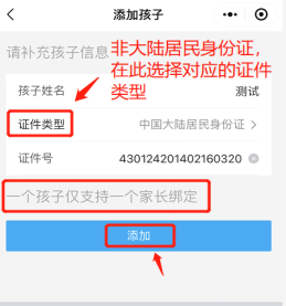 (四)添加孩子信息 家长点击对应的报名入口后,首先点击完善孩子信息,输入孩子姓名+证件类型+证件号,此信息作为孩子报名的基础信息,学生姓名+身份证号请务必输入准确(学生姓名不能出现错别字、同音字,与户籍本上保持一致。如发现姓名填写错误请进入个人中心—我的孩子—点击对应错误“学生姓名”进行修改—点击“确认”则修改成功)。如有多个孩子同时报名,请进入个人中心—我的孩子,点击“添加孩子”即可。一个家长账号可以绑定多个孩子,如下图所示: