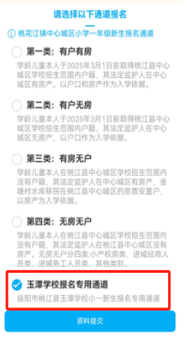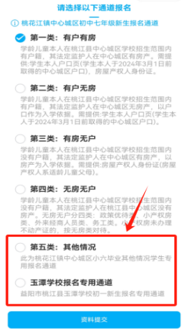 (五)选择报名通道 孩子信息添加成功后,点击对应的孩子进入报名通道界面,对于每个通道及生源类型的定义,下方有文字提示说明。请家长根据自己的真实情况选择正确的报名通道(请注意:根据各家庭情况不同选择对应的报名通道,请仔细阅读,避免错误选择通道延误报名)后再点击下方的资料提交。例:县城中心城区小学一年级有五个报名通道;初中七年级有六个报名通道;插班生转学报名分小学插班生报名通道和初中插班生报名通道,对于每个通道及生源类型的定义,下方有文字提示说明。如下图所示: