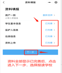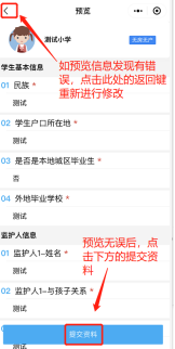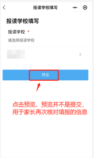 点击下一步,进入学校填报,选择两所符合招生范围及政策要求的不同学校,点击下方的预览,家长可再次预览自己填写的所有报名信息。如检查未发现问题则点击下方的“提交资料”,才出现“报名信息提交成功”的界面。如预览后发现有需要修改的信息,则点击左上角的返回键,可进行重新填写及修改。如下图所示: