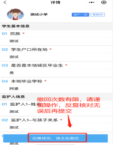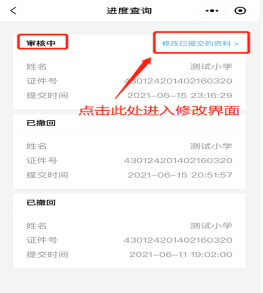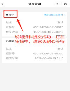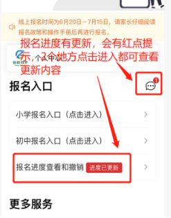 (七)报名进度查看和撤销 点击进入首页的“报名进度查看和撤销”查看报名进度和自主撤回的操作。 报名进度查询:显示“审核中”,则说明资料提交成功正在审核,请耐心等待。如进度有更新,将通过短信通知提醒家长,家长收到通知后,可重新点击进入报名平台,首页会有红点提示。如下图所示: